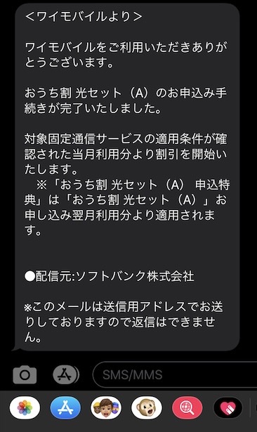 おうち割 光セット(A)申込完了 SMS がすぐに届きました。