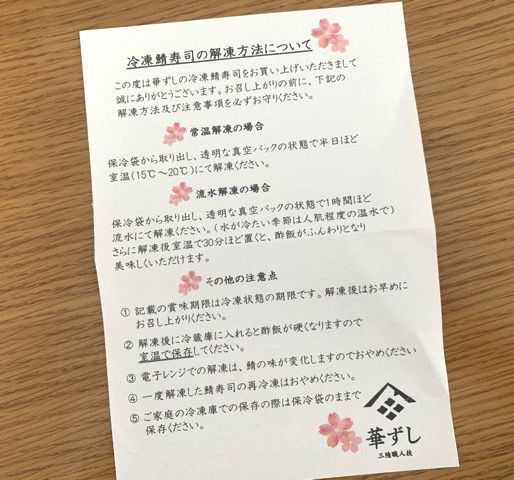 華ずし 可愛い解凍方法の説明書が添付されています。その他注意点も書いてあります。